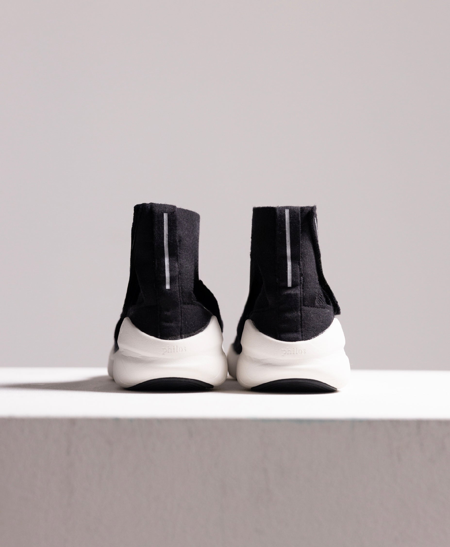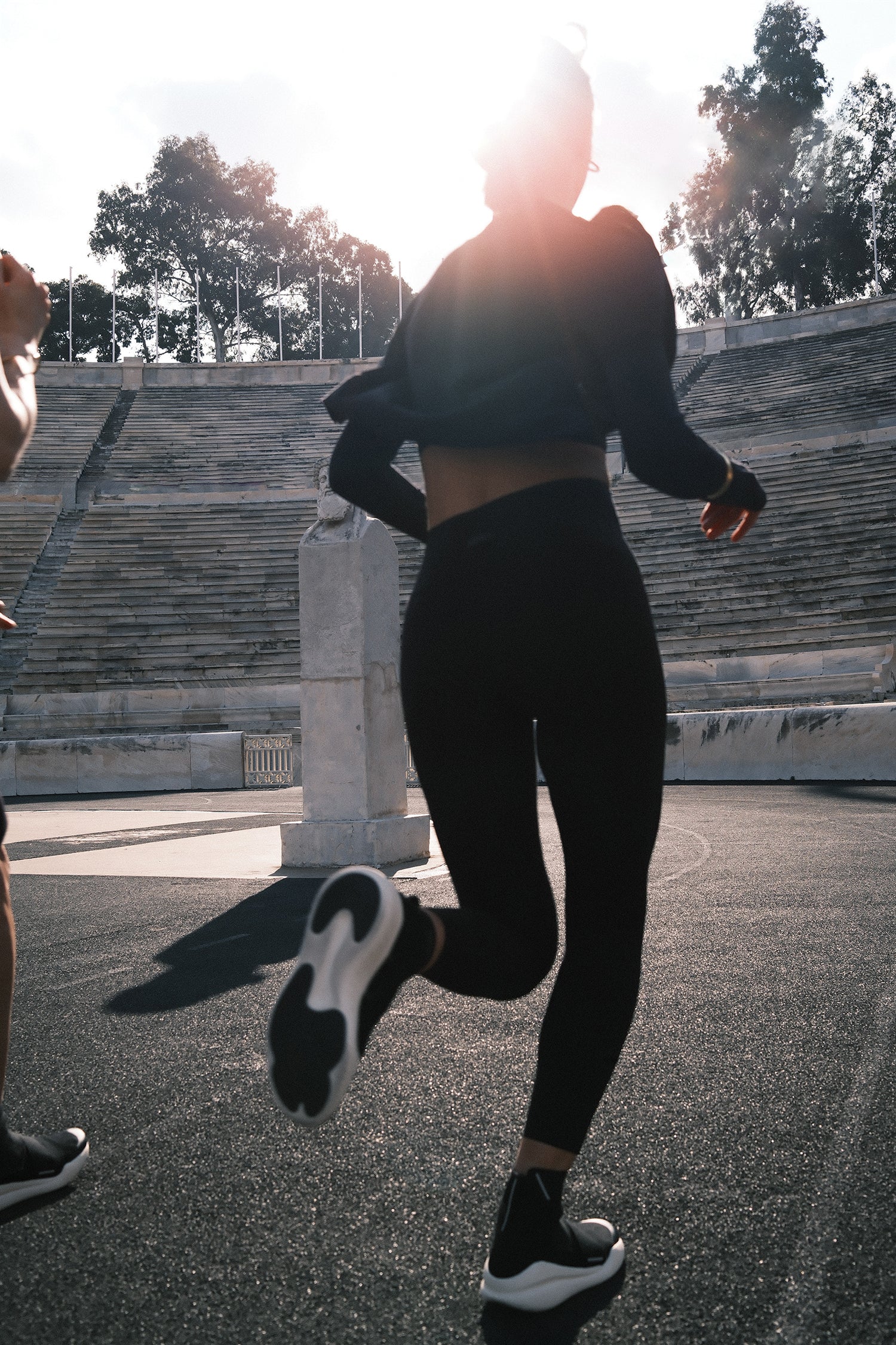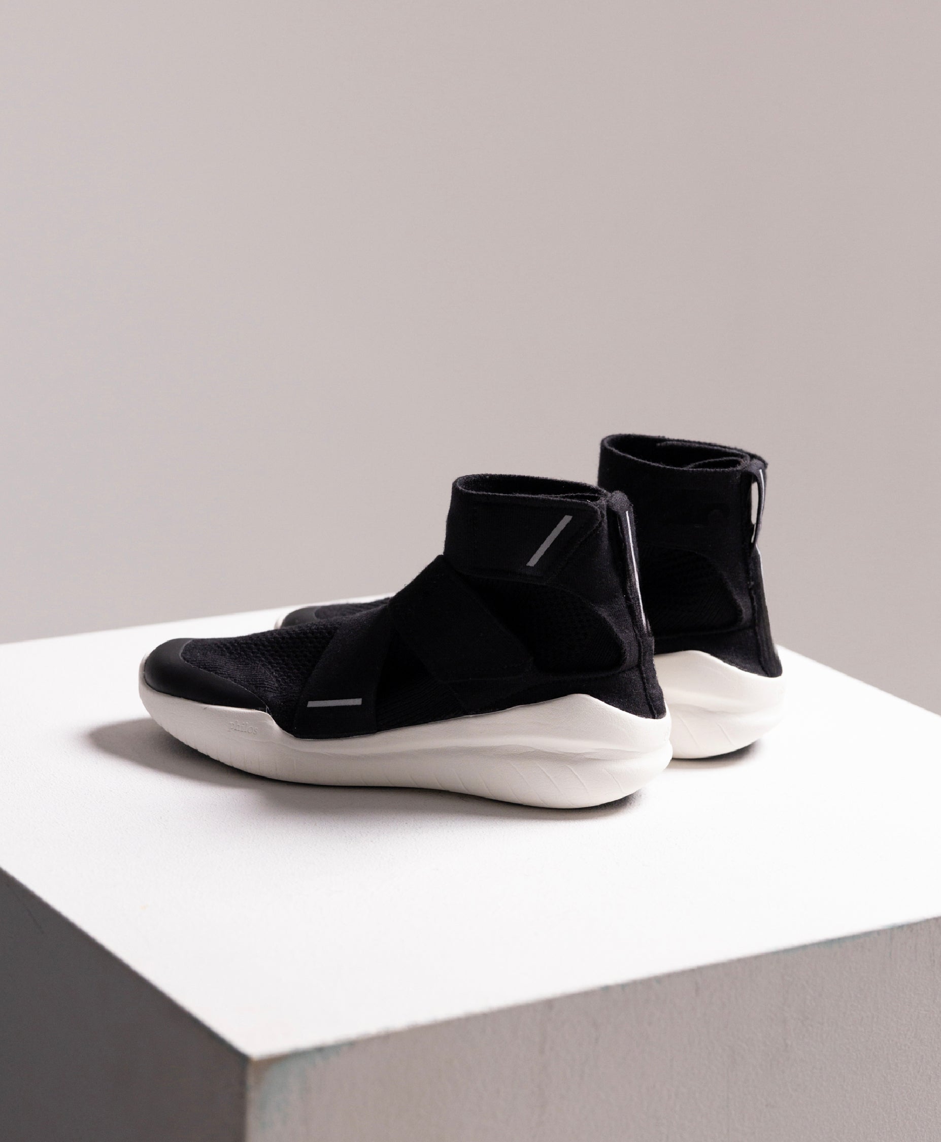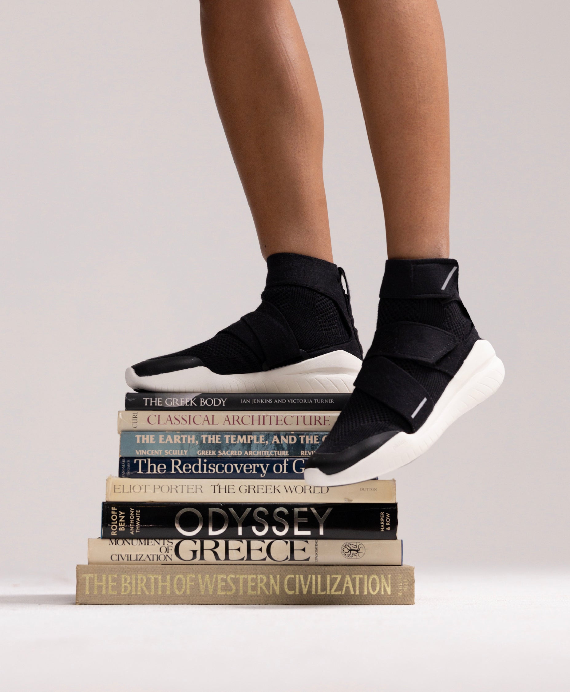 Laceless design. Philos Athena purposefully rejects laces, as standard shoelaces restrict blood circulation as the foot expands while running. The Athena secures and supports the foot and ankle while encouraging blood flow during runs.