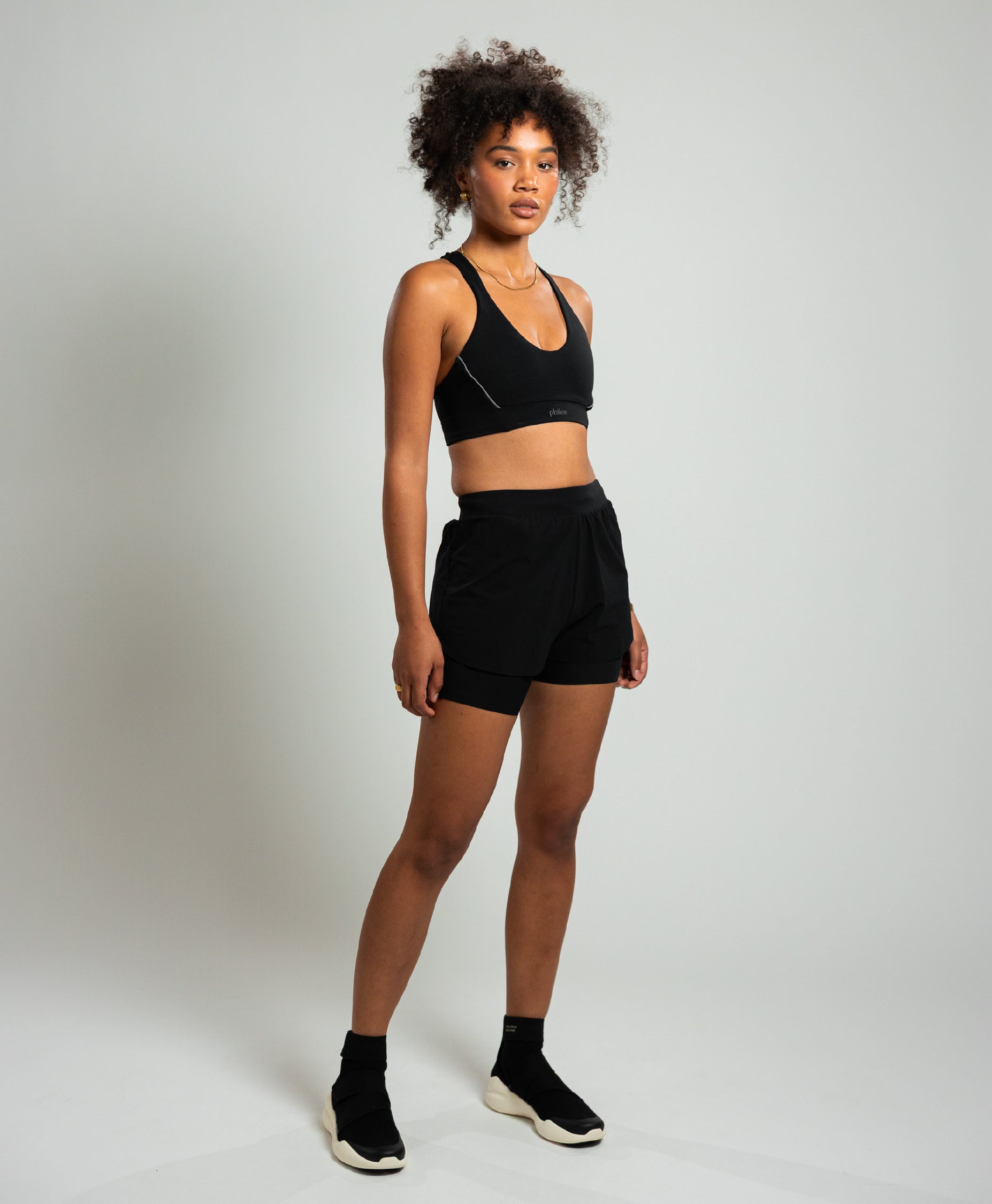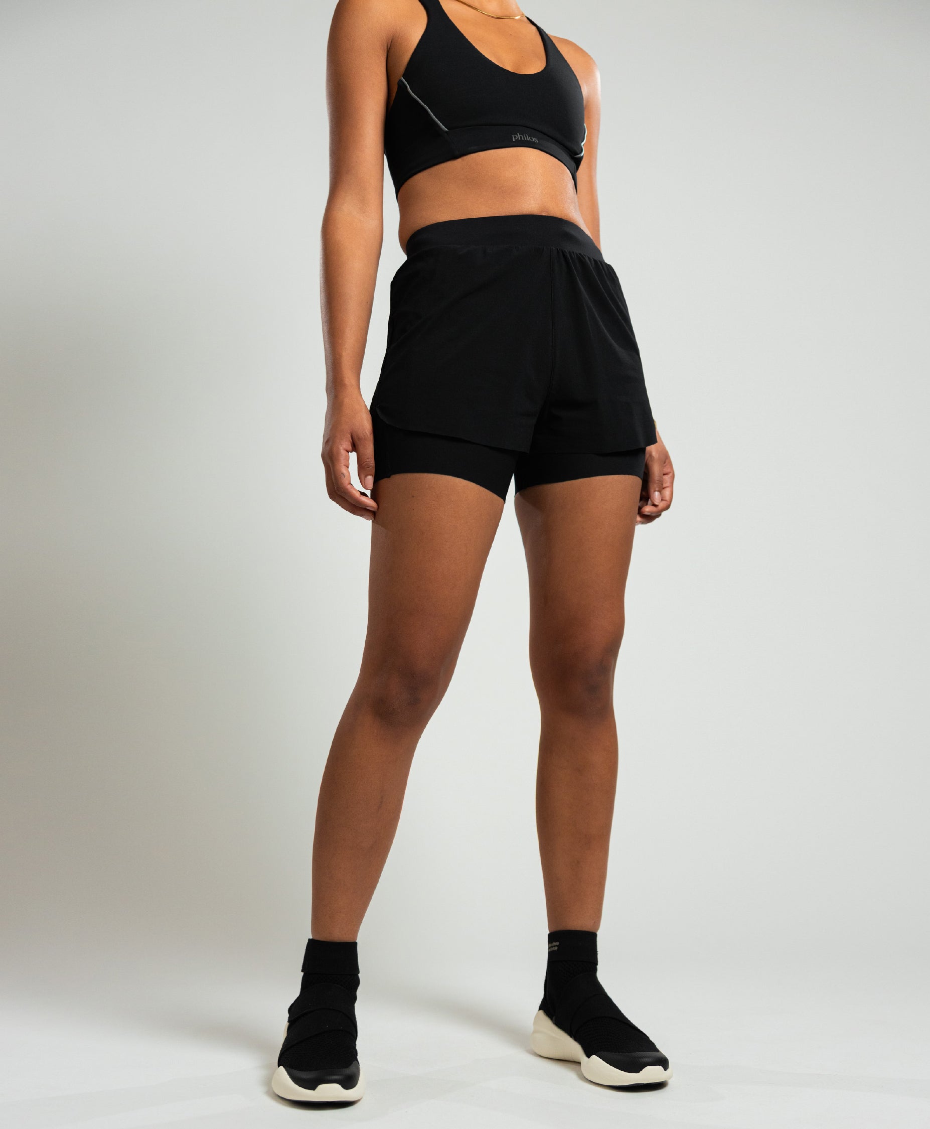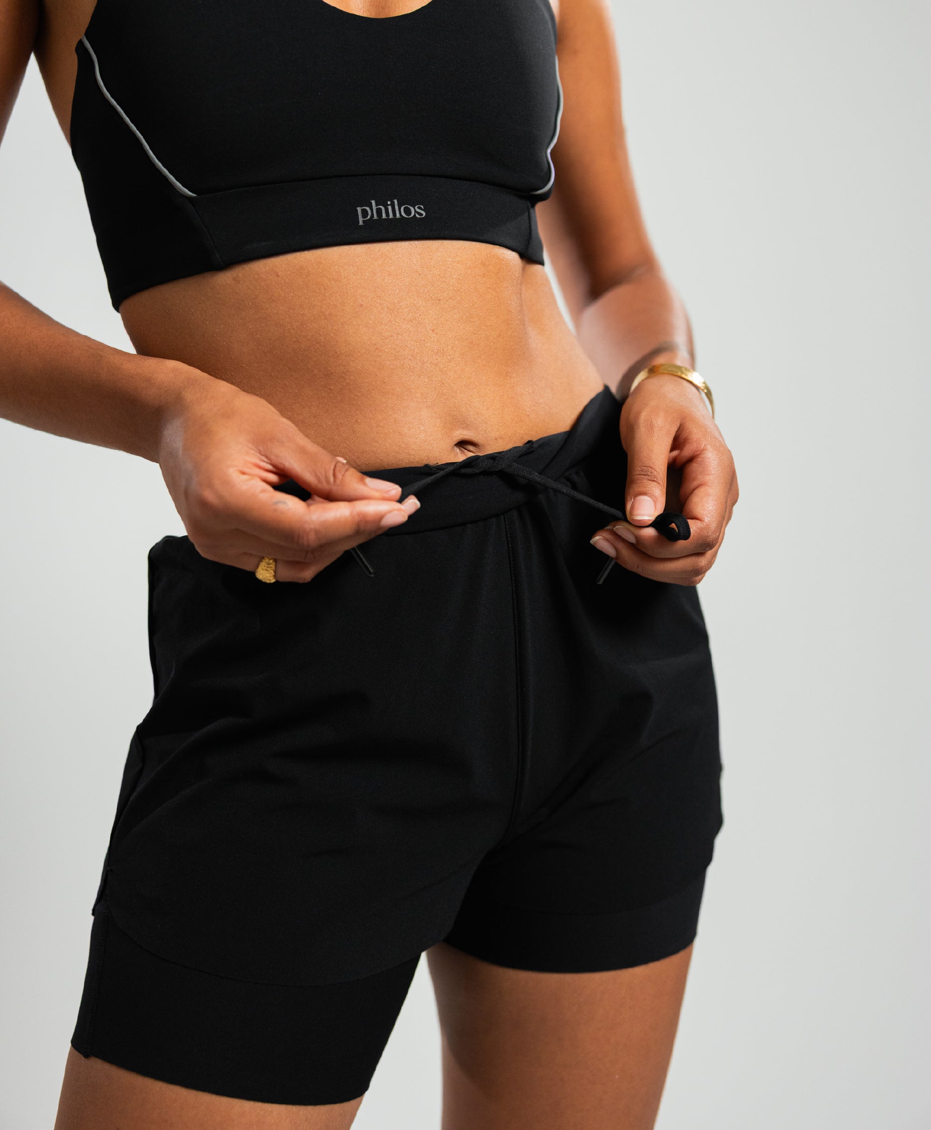 Our bestselling Philos women’s running 2-in-1 shorts are precision-engineered for performance. The base layer is expertly crafted from Aéras™, our award-winning performance knit made in France (66% nylon, 34% elastane), with a super smooth feel on the skin that prevents chafing during movement. The outer layer is a featherweight and breathable performance fabric made in Italy. The short is precision tailored in Portugal by a female-owned manufacturer, these high-waisted women’s running shorts deliver soft compression that sculpts and flatters while moving comfortably with your body. The fabric is sweat-wicking, fast drying, and designed with 4-way performance stretch and SPF protection, ensuring comfort and coverage from your daily run to race day. Engineered as your all-season running shorts, whether you’re racing in summer heat or layering in colder months.