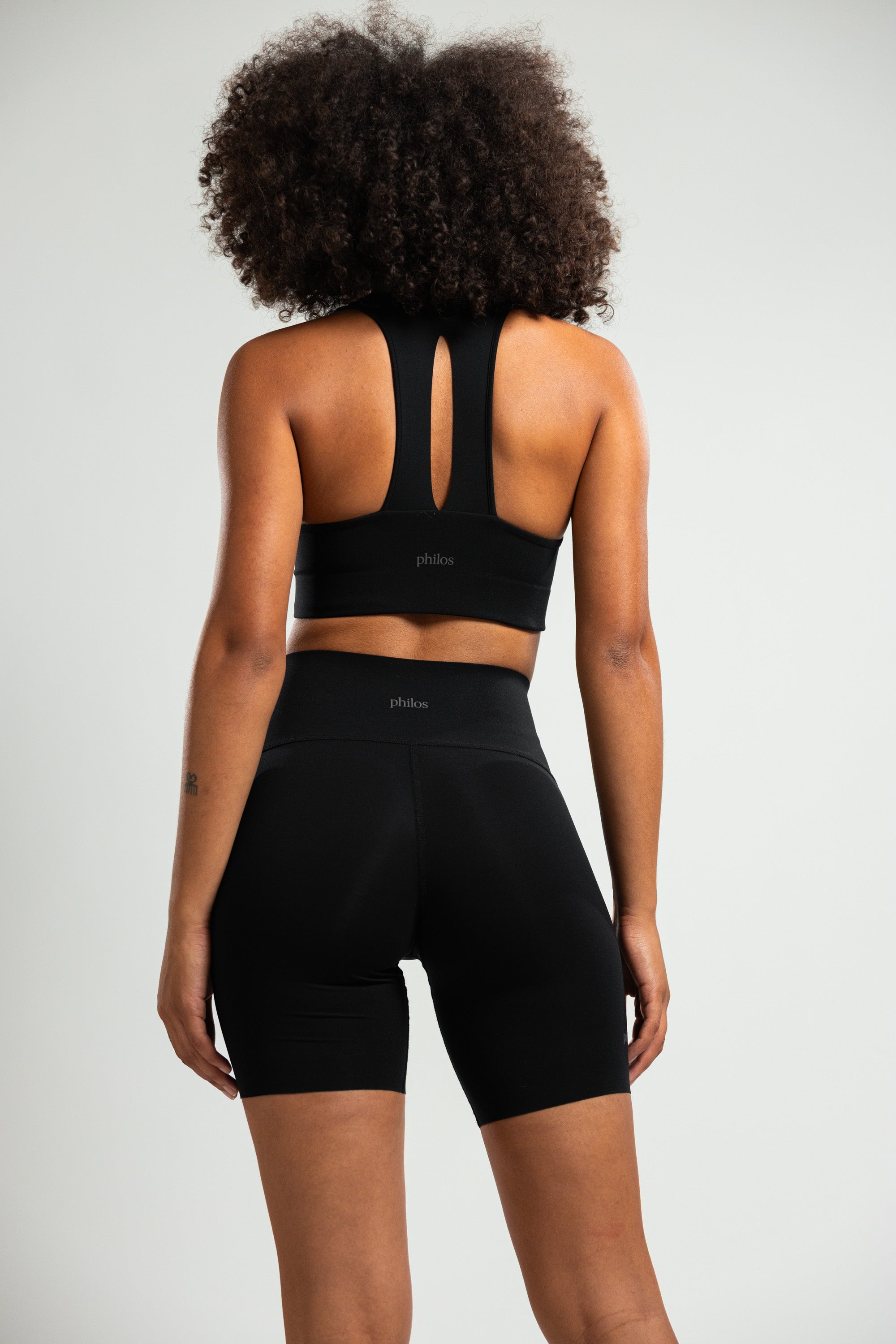 The Philos Running Scoop Bra is a medium-support sports bra, with a slightly compressive fit. We recommend this running bra for A-C cup sizes for mid to high-impact running and workouts. It also has removable cups for comfort and preference. For larger cup sizes, we recommend the Philos Running Sports Bra, which is offers higher support for A–E cup sizes.